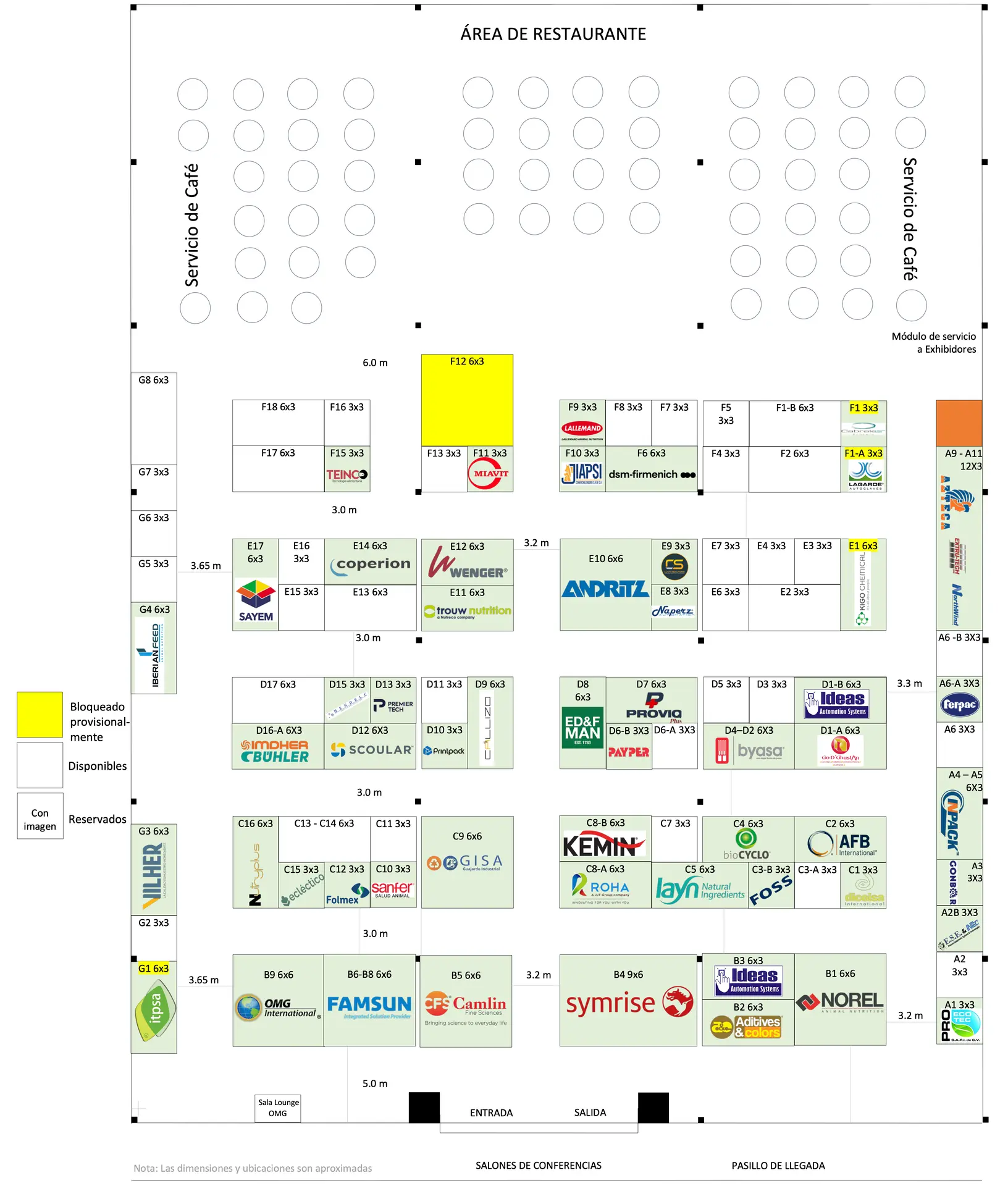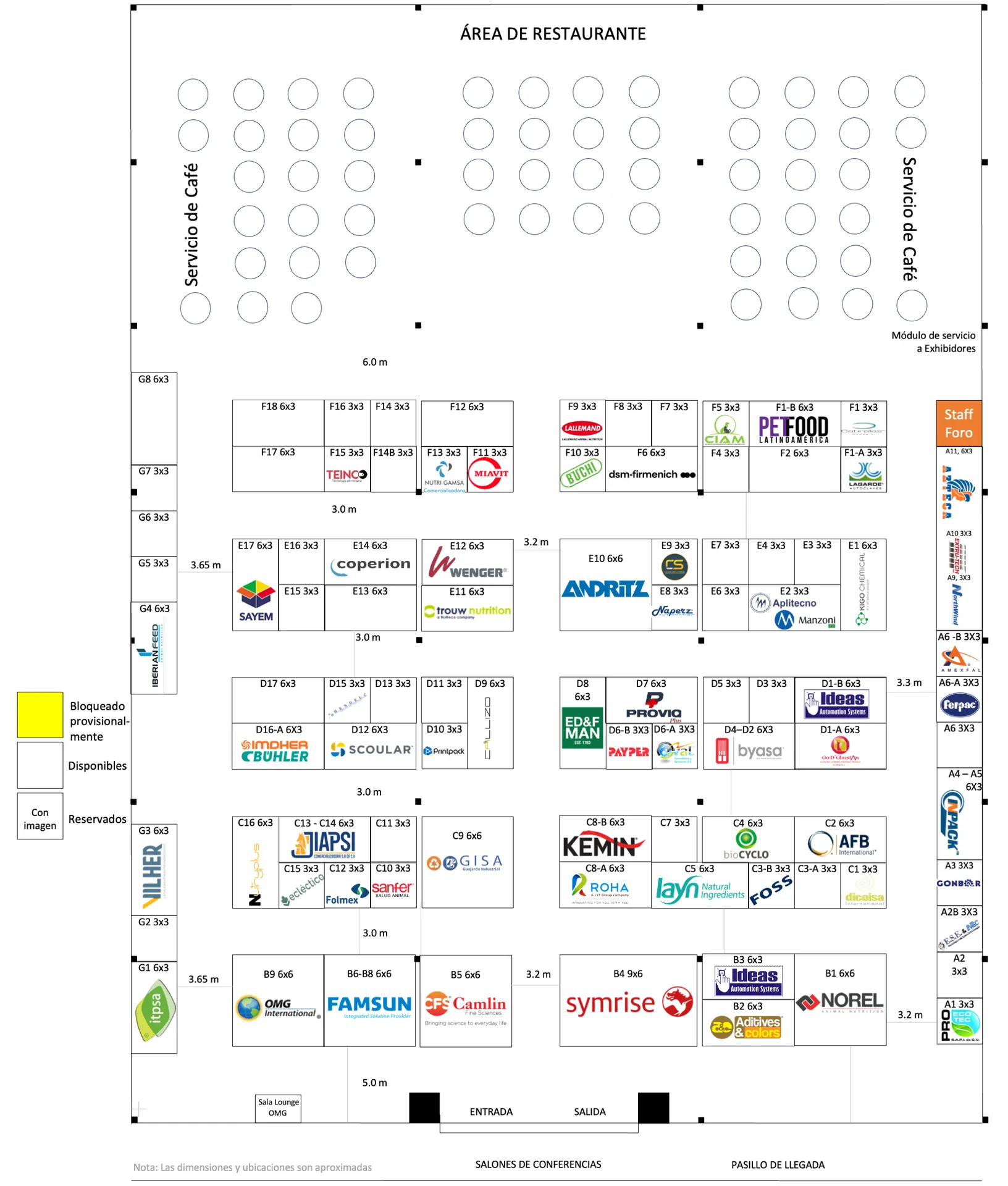 TIPO / TYPE E | Frente: 9 m; Fondo: 6 m; Área: 54 m2 / Front: 9 m; Depth: 6 m; Area: 54 m2 Pases staff: 6; Pases a conferencias: 5 Pases sin costo área comercial: 5 / Staff passes: 6; Conference passes: 5, Free passes to the commercial area: 5 IMPORTANTE / IMPORTANT: Los