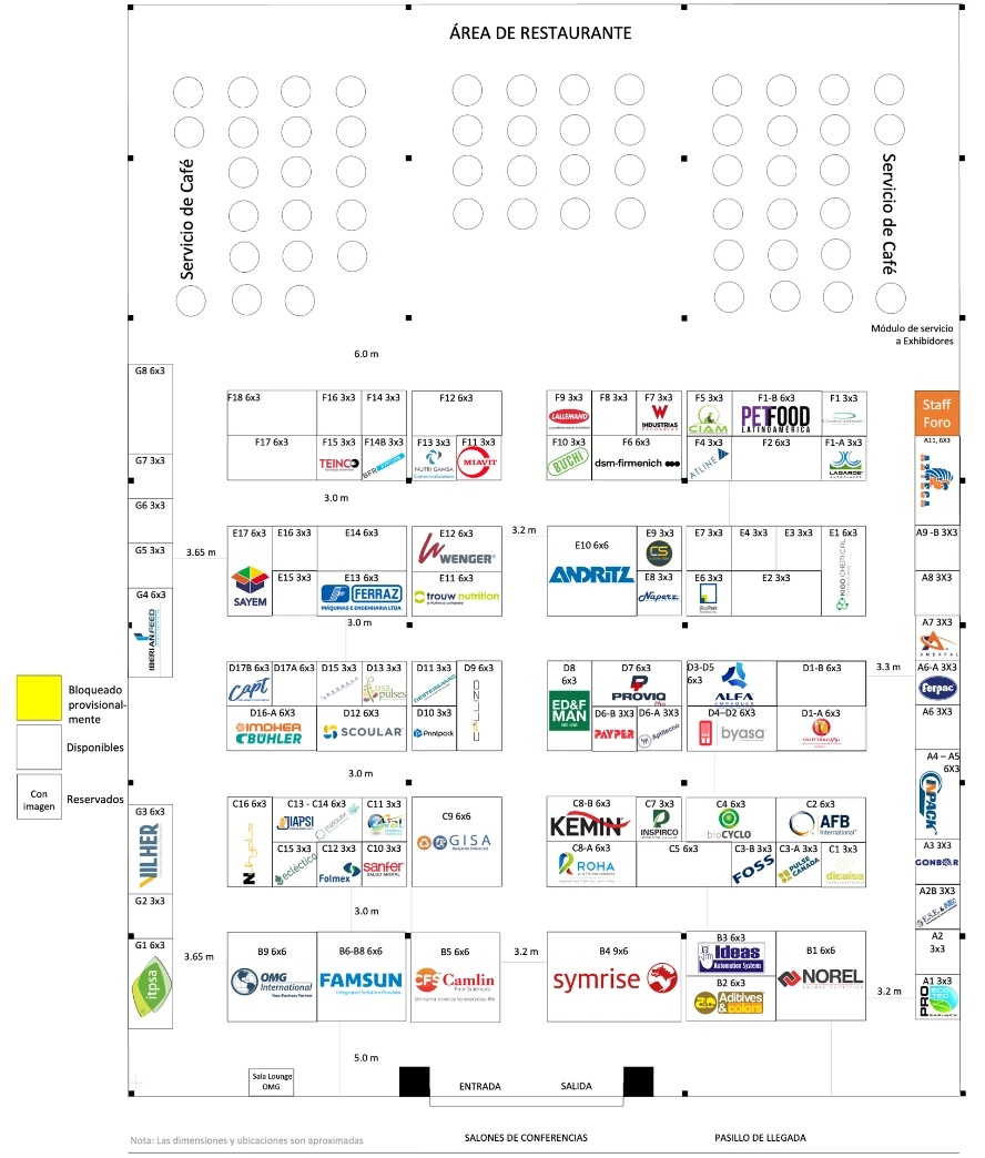 TIPO / TYPE E | Frente: 9 m; Fondo: 6 m; Área: 54 m2 / Front: 9 m; Depth: 6 m; Area: 54 m2 Pases staff: 6; Pases a conferencias: 5 Pases sin costo área comercial: 5 / Staff passes: 6; Conference passes: 5, Free passes to the commercial area: 5 IMPORTANTE / IMPORTANT: Los